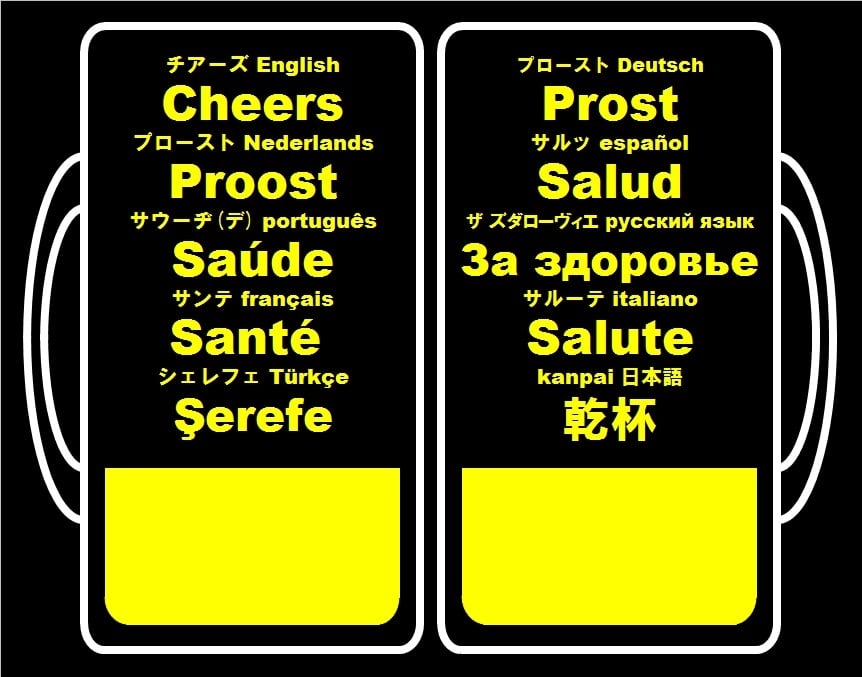右上よりドイツ語・スペイン語・ロシア語・イタリア語・日本語での「乾杯」をモチーフにしたTシャツ。
