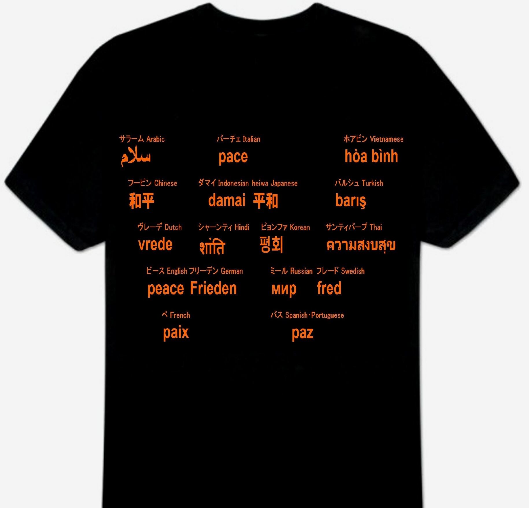 アラビア語・中国語・オランダ語・英語・フランス語・ドイツ語・ヒンディー語・インドネシア語・イタリア語・日本語・韓国語・ロシア語・スペイン語・ポルトガル語・スウェーデン語・タイ語・トルコ語・ベトナム語での「平和」
