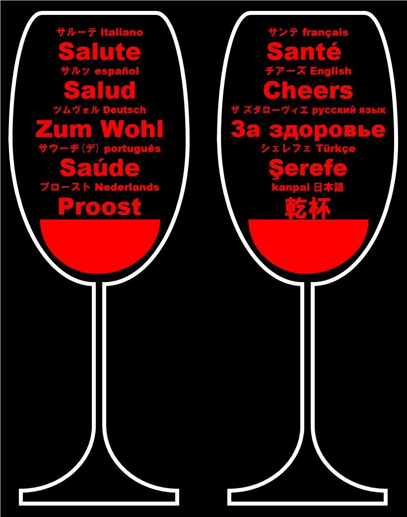 右上よりフランス語・英語・ロシア語・トルコ語・日本語での「乾杯」をモチーフにしたトレーナー。